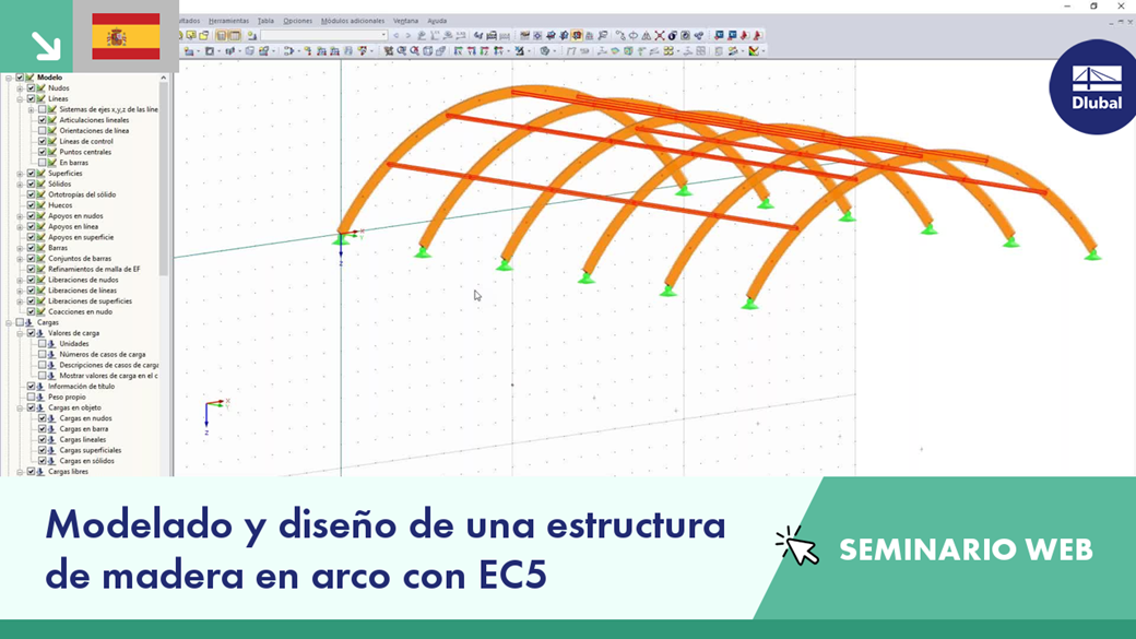 Este seminario web muestra el modelado de una estructura de madera en arco en 3D en RFEM, la inserción de cargas y combinaciones y el diseño de los elementos de madera en RF-TIMBER Pro.