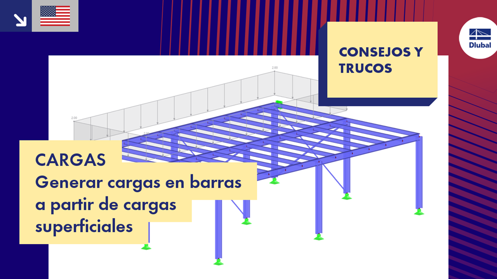 El vídeo muestra cómo usar la función "Generar cargas" para convertir automáticamente las cargas superficiales en cargas en barras. Para esto, hay opciones para generar cargas a través de un plano o celdas.