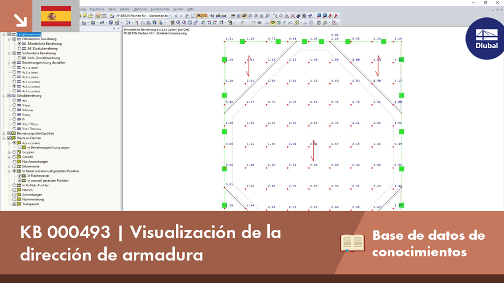 En RF -CONCRETE Surfaces, una armadura de superficie se diseña utilizando una malla de armadura libremente definible. Puede visualizar la dirección de la armadura en RF -CONCRETE Surfaces activando la flecha de la armadura que simboliza la dirección de la armadura.