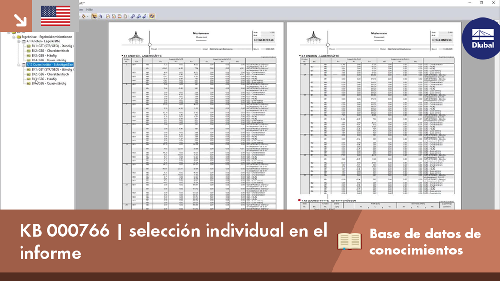 El contenido que se muestra en las tablas de cargas y resultados se puede gestionar en la selección global del informe (rojo). La selección individual (verde) permite una asignación adicional de diferentes combinaciones de cargas para las tablas correspondientes. Dado que esta selección específica contradice la global, se ha implementado una comprobación (violeta). De modo que la selección individual sólo se remplaza si se selecciona la casilla de verificación.