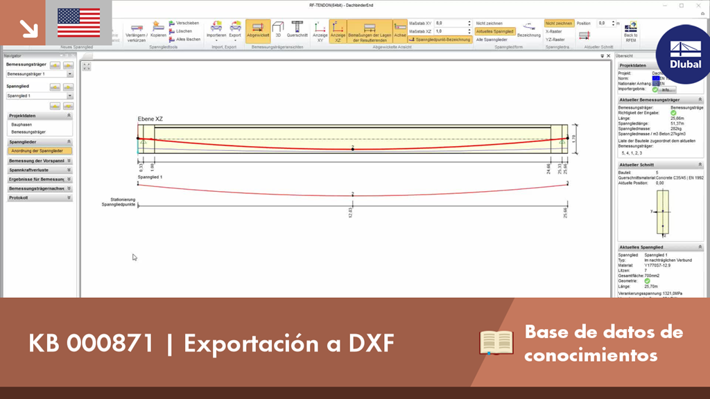 Una vez que haya determinado la geometría final del tendón en RF -TENDON, puede ser útil exportar el modelo a un programa de CAD. Para este propósito, el módulo incluye la opción de exportar el archivo en formato de archivo .dxf. Puede seleccionar la función de exportación haciendo clic con el botón secundario en el espacio de trabajo. Después de seleccionar el formato DXF y la ubicación de almacenamiento, se pueden realizar ajustes adicionales.