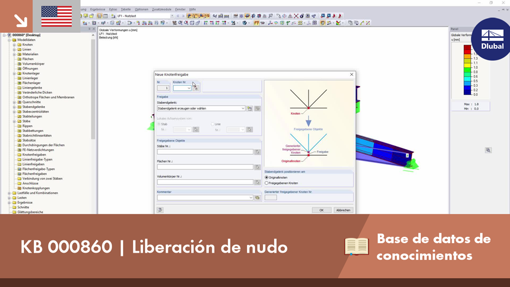 Ocasionalmente, es necesario considerar en un modelo que algunas vigas solo se encuentran sueltas una encima de la otra sin atornillarse ni soldarse. En RFEM 5 puede encontrar fácilmente esta condición con una liberación de nudo. Para ello, es necesario definir una articulación con la condición de liberación deseada en el nudo relevante en el cuadro de diálogo de liberación de nudo. El ejemplo mostrado en la imagen corresponde a esto con una liberación del esfuerzo cortante con la propiedad de ser fijo y Vz positivo. Con una carga de levantamiento como la siguiente se produce el desacoplamiento de ambas barras.