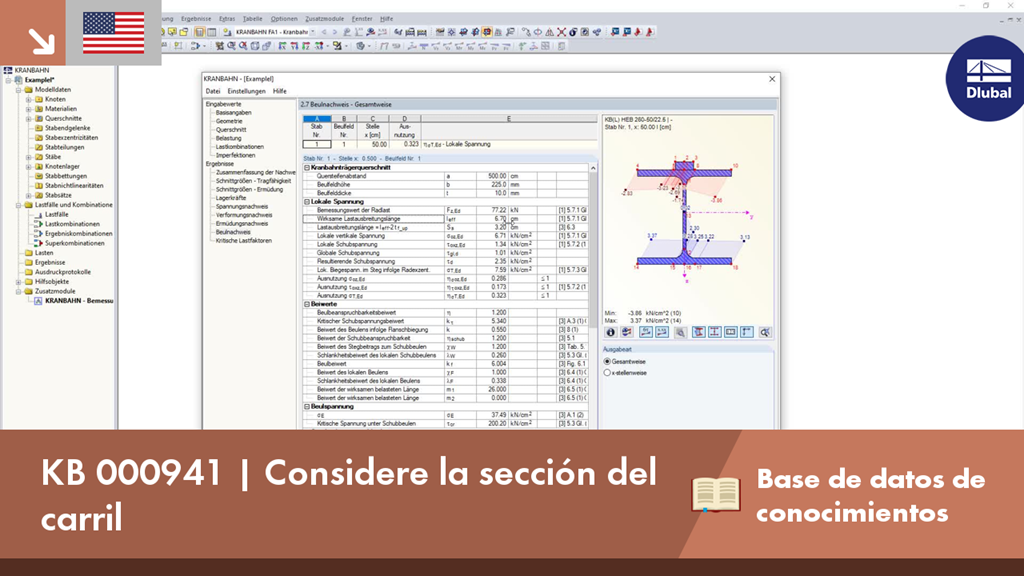 En CRANEWAY, la acción de un carril como "estáticamente eficaz" o "estáticamente ineficaz" se define en "Conexión carril -brida" en el cuadro de diálogo Detalles. Esta configuración controla el cálculo de la longitud de introducción de la carga según EN 1993-6, tab. 5.1.