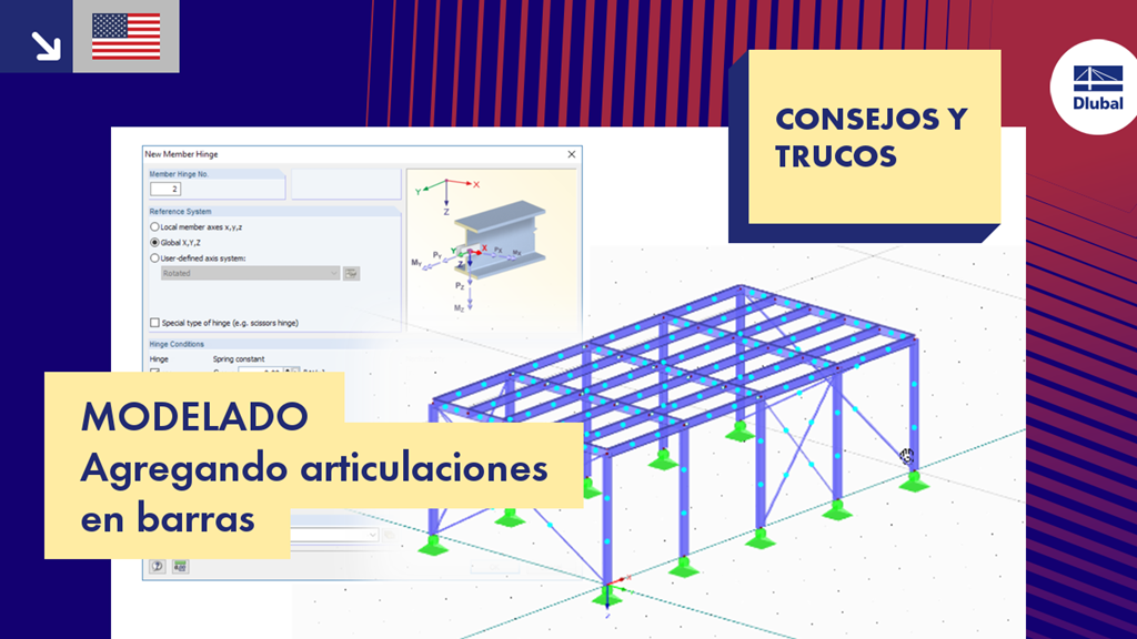 En este vídeo de consejos y trucos, le mostramos cómo agregar articulaciones en barras de cuatro formas diferentes en RFEM. Las articulaciones en barras son, según nuestro Wiki de análisis de estructuras, articulaciones que se pueden disponer al inicio o al final de las barras para limitar la transmisión de esfuerzos internos.