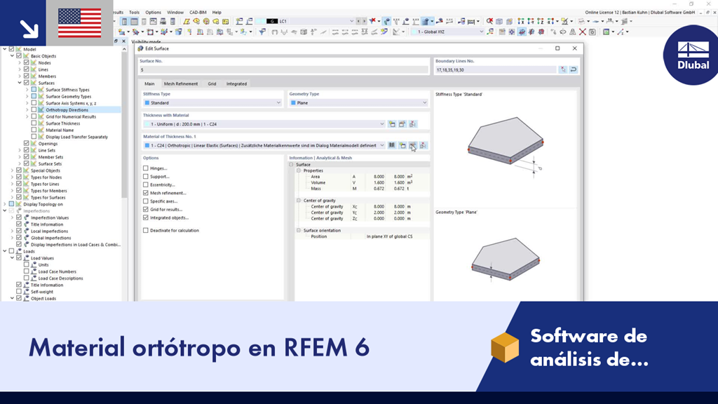 En este vídeo se muestra cómo se pueden definir los materiales ortótropos e isótropos utilizando el tipo de espesor de material en RFEM 6. El material ortótropo describe un comportamiento del material donde en una superficie 2D se puede definir una mayor rigidez en la dirección x de la cáscara en comparación con la dirección y. Para sólidos 3D también es posible definir un comportamiento del material diferente en la dirección z.