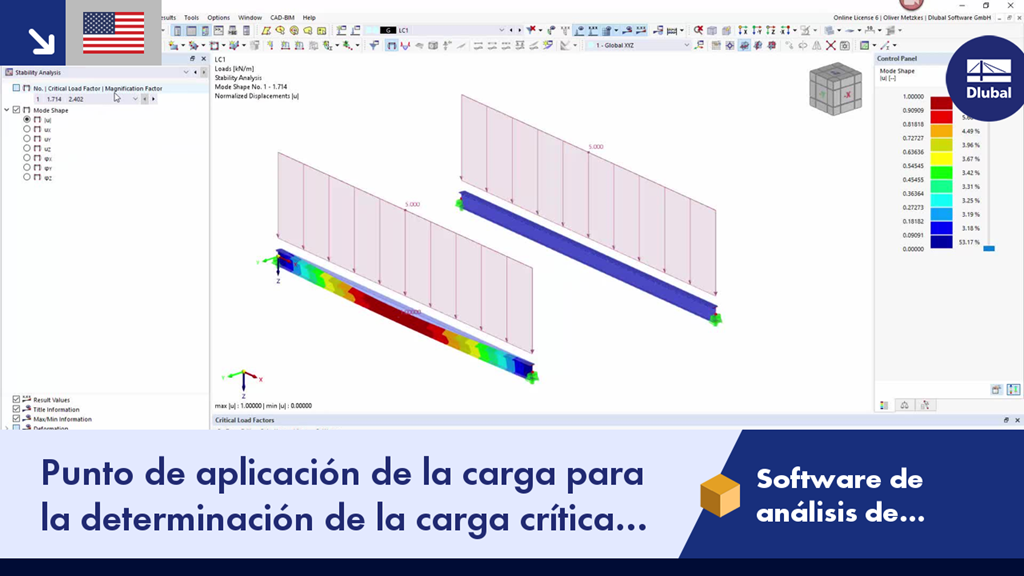 En el vídeo mostramos la definición de la carga excéntrica en una barra y su efecto en el factor de carga crítica para el pandeo lateral. Una carga aplicada en el ala comprimida tendrá un efecto desestabilizador en este caso, el cual se considera correctamente en RFEM. Utilizamos los complementos de análisis de RFEM 6 de Estabilidad de la estructura y Alabeo por torsión (7 GDL).