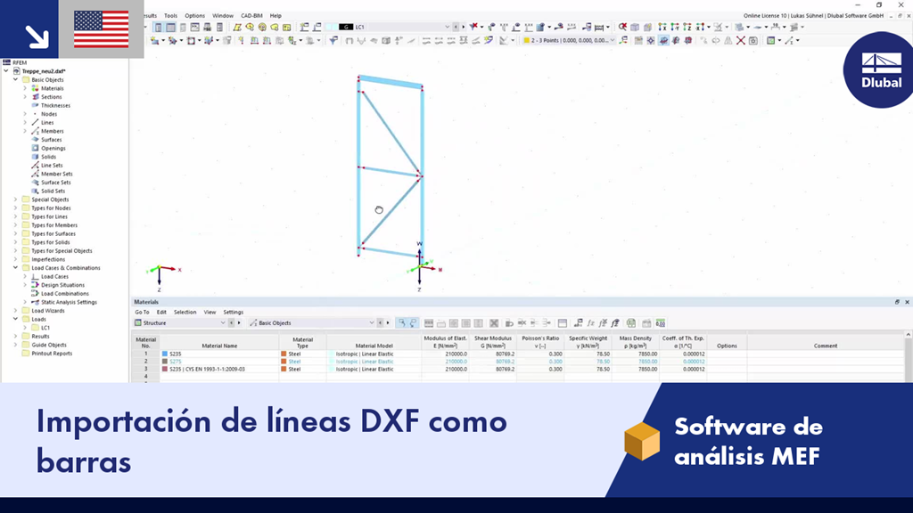 Este vídeo muestra la importación de un archivo DXF. La descripción de las capas contiene la sección del perfil y el nombre del material. RFEM usa la información durante la importación para convertir las líneas en barras.