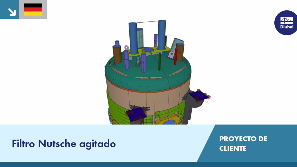 Para este proyecto de diseño de esta instalación de filtrado/secado incluyendo el agitador se requirió un análisis completo de tensiones y deformaciones en RFEM. El complejo modelado representó un desafío especial para el diseño de la estructura que se compone de 1 424 superficies, 158 sólidos y 425 barras.