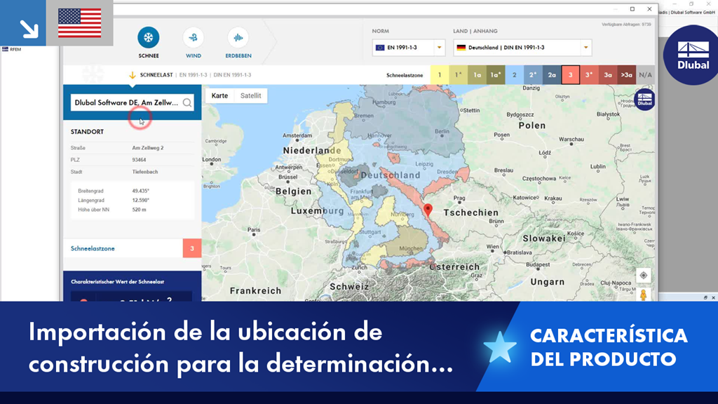 La ubicación de la construcción se puede especificar en un mapa digital. Además de los datos de la dirección (incluida la altitud), se importa automáticamente la zona de carga de nieve, la zona de viento y la zona sísmica. Estos datos, a su vez, son utilizados por los asistentes de cargas.