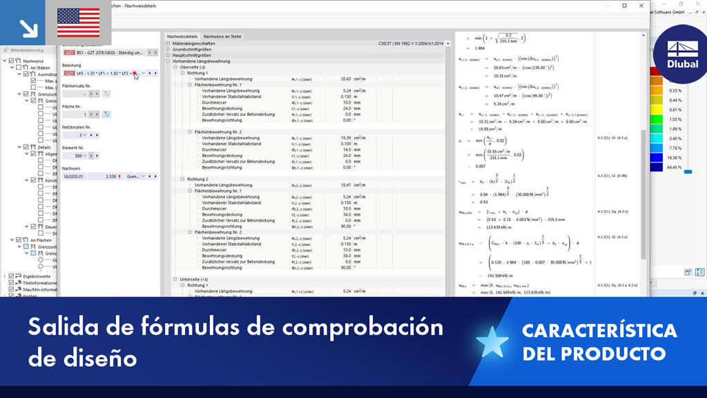 Para cálculos y dimensionamientos en estructuras de hormigón (concreto) armado, acero, madera, aluminio, etc., se muestran en detalle las fórmulas de comprobación de cálculo utilizadas (incluyendo una referencia a la ecuación utilizada de la norma). Estas fórmulas de comprobación de cálculo también se pueden incluir en el informe.