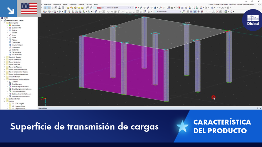 La superficie con el tipo de rigidez "Transmisión de cargas" no tiene ningún efecto estructural. Se puede usar para considerar cargas de superficies que no se han modelado (por ejemplo, estructuras de fachadas, superficies de vidrio, secciones trapezoidales de cubiertas, etc.).