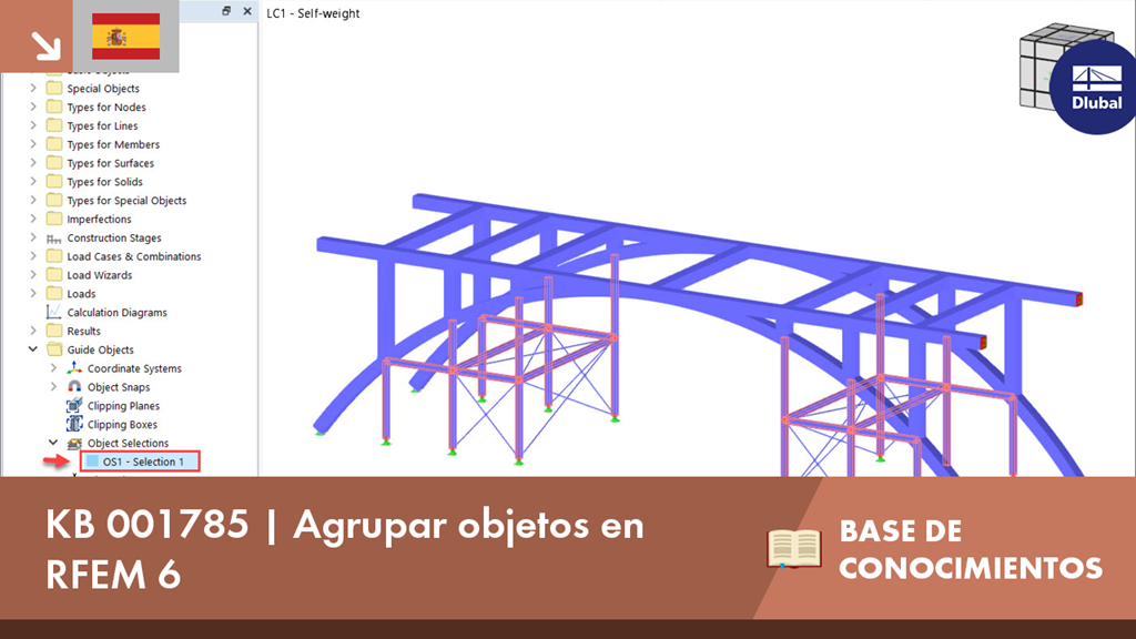 La selección de objetos es una agrupación de objetos que cumplen ciertos criterios que se han definido en el programa. Así, los objetos que cumplen los criterios definidos se pueden seleccionar y editar al mismo tiempo. Este vídeo le mostrará cómo hacerlo con "Selección de objetos" como nuevo objeto auxiliar de RFEM 6 o RSTAB 9.