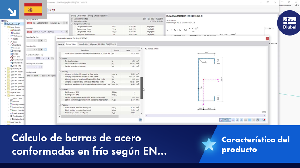 No importa si son perfiles conformados en frío de la biblioteca de secciones o secciones conformadas en frío (no perforadas) generales de RSECTION, su programa de análisis estructural le ayudará a determinar la sección eficaz, teniendo en cuenta el pandeo local y la inestabilidad. También puede realizar una comprobación de la sección según EN 1993-1-3, 6.1.6. En este caso, se tienen en cuenta los esfuerzos internos del cálculo con el complemento Torsión de alabeo (7 grados de libertad) utilizando el análisis de tensiones equivalente.