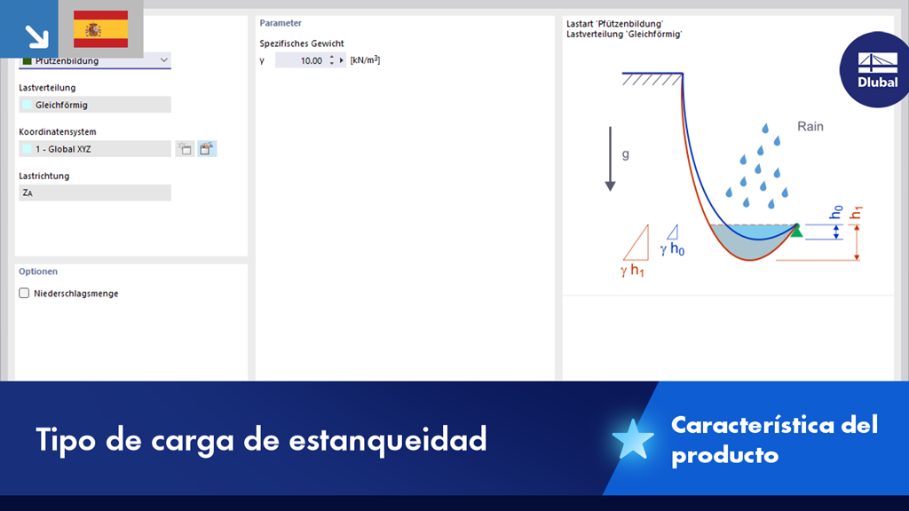 El tipo de carga de agua estancada permite simular acciones de lluvia en superficies curvas múltiples, considerando los desplazamientos según el análisis de grandes deformaciones.