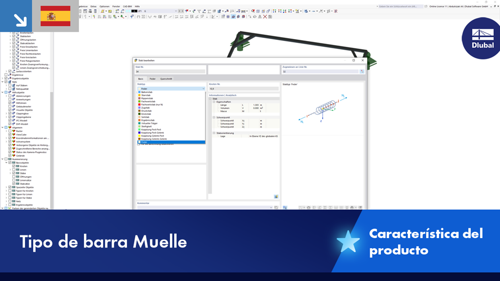 El tipo de barra "Muelle" se usa para simular propiedades de muelles lineales y no lineales mediante un objeto lineal. Esta función de entrada le ayuda a modelar las especificaciones de rigidez en la unidad de fuerza/desplazamiento.