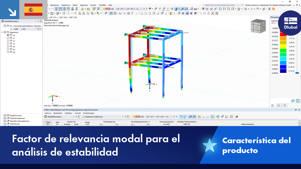 El factor de relevancia modal (MRF) puede ayudarle a evaluar en qué medida los elementos específicos participan en la deformada de un modo. El cálculo se basa en la energía de deformación elástica relativa de cada barra individual.