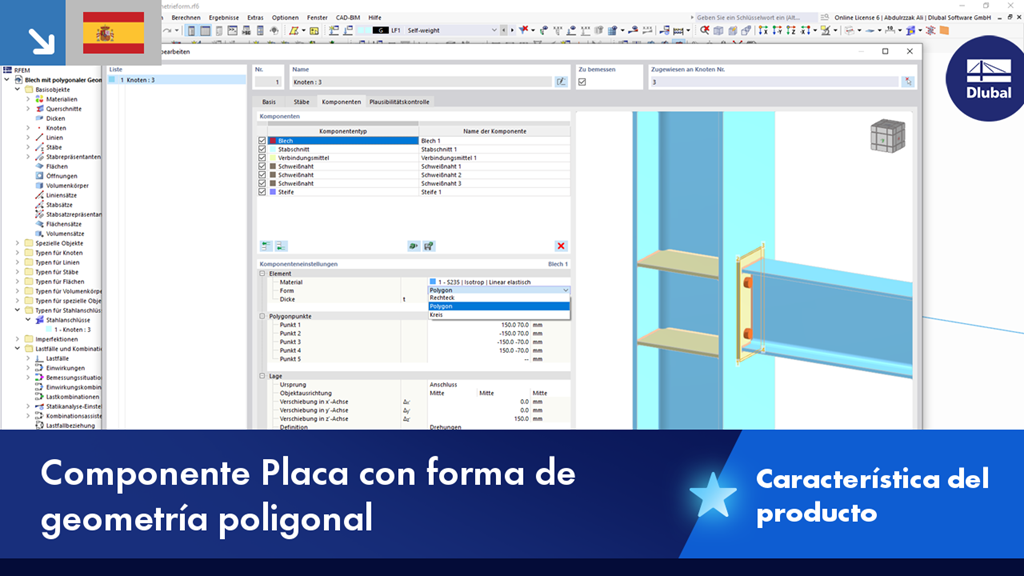 En el complemento Uniones de acero, puede disponer las placas en varias formas geométricas. Además de las formas "Rectángulo" y "Círculo", también está disponible la forma "Polígono". La forma poligonal se define introduciendo las coordenadas de los puntos.