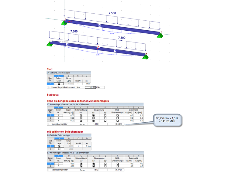 Para una viga de un solo vano, el análisis de pandeo lateral en RF-STEEL EC3 se realiza con el método de barra equivalente y un apoyo intermedio en el medio, y se compara con un cálculo según el método general y un apoyo en nudo central.