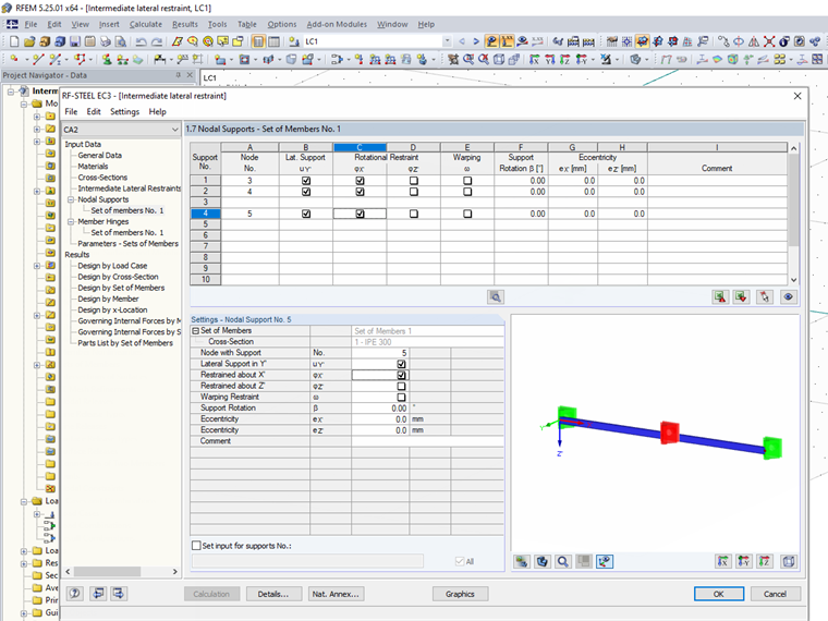 Sin embargo, el soporte en nudo ofrece más opciones para la entrada definida por el usuario que el soporte intermedio, dependiendo del módulo adicional. En la mayoría de los módulos adicionales, el apoyo intermedio se aplica como un apoyo de la horquilla con una coacción del desplazamiento lateral y una coacción al giro alrededor del eje longitudinal. Sin embargo, en los módulos adicionales RF-/STEEL EC3 y RF-/STEEL AISC, también es posible distinguir entre un apoyo articulado en el ala superior o inferior, un apoyo de la horquilla o un apoyo lateral definido por el usuario.