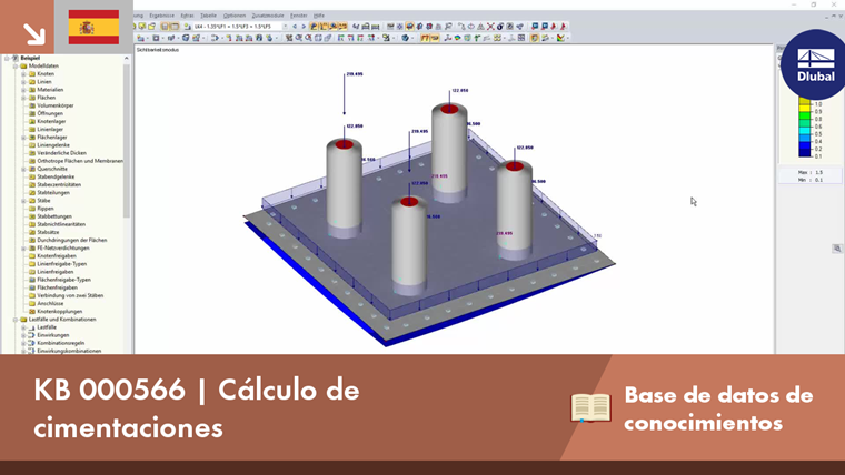 Para el cálculo de la losa de cimentación, utilizamos RF-CONCRETE Surfaces para el cálculo de flexión y la comprobación del ancho de fisura. Las bases en aumento se pueden calcular con RF-CONCRETE Members. El cálculo de resistencia a punzonamiento de las bases individuales en las losas se lleva a cabo con el módulo RF-PUNCH. Las comprobaciones geotécnicas se pueden realizar manualmente por medio de la salida de la presión de suelo existente. Con el módulo RF-SOILIN, puede introducir los parámetros del suelo desde un informe de investigación del suelo para determinar los coeficientes de cimentación y considerarlos en el cálculo de RFEM.