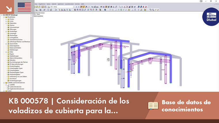Para hacer esto, use el generador de cargas para definir los nudos de las esquinas de la geometría de la cubierta, incluyendo las distancias de la cubierta. En la parte izquierda de la figura, sin embargo, la aplicación de la carga se realiza sin contar con el voladizo. Con esta opción, también es muy fácil especificar las cargas de un voladizo de cubierta en el lado del hastial.