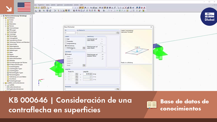 Sin embargo, el cálculo de la contraflecha no se realiza con una carga interna equivalente como en el caso de una barra, sino que se aplica una deformación real al sistema o la superficie. El cálculo de la deformación también se puede representar mediante un modelo de segmento circular.