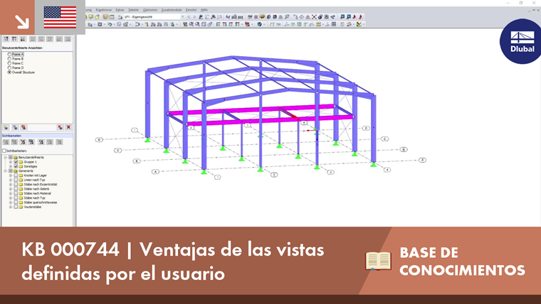 Hay una vista general de la estructura, así como también las vistas de cada pórtico con los respectivos ejes de rejilla. Para cambiar entre la vista general a la vista del pórtico A, se necesitaría hacer ajustes en el renderizado, las visibilidades y en la selección de la linea auxiliar respectiva. Sin embargo, si estas vistas se han definido previamente, tan sólo se necesita un clic en la vista correspondiente.