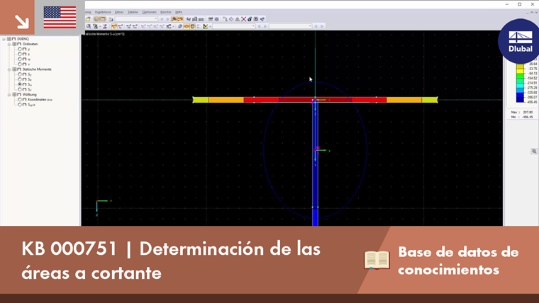 Im abgebildeten Beispiel ist die Schubfläche eines T-Querschnitts berechnet worden. SHAPE -THIN no usa la expresión simplificada según el Eurocódigo, pero las áreas de cortante se determinan usando el primer momento de área. Este procedimiento se puede utilizar para todas las formas de sección.