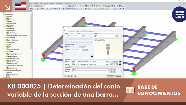 Si se usa la función "Conectar líneas o barras" (dibujar la ventana de selección a través de la parte estructural mencionada), la barra de sección variable se dividirá en los nudos del 3 al 7. El programa determina el canto de la sección correcta automáticamente, por lo que no necesita especificarlo de antemano. Si se agregaron excentricidades de barra diferentes al inicio y al final de la barra de sección variable, esto también se interpolará correctamente en los nudos intermedios.