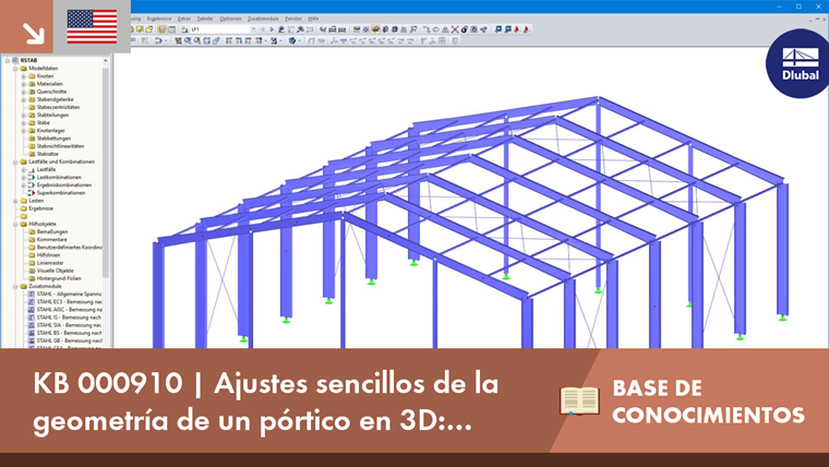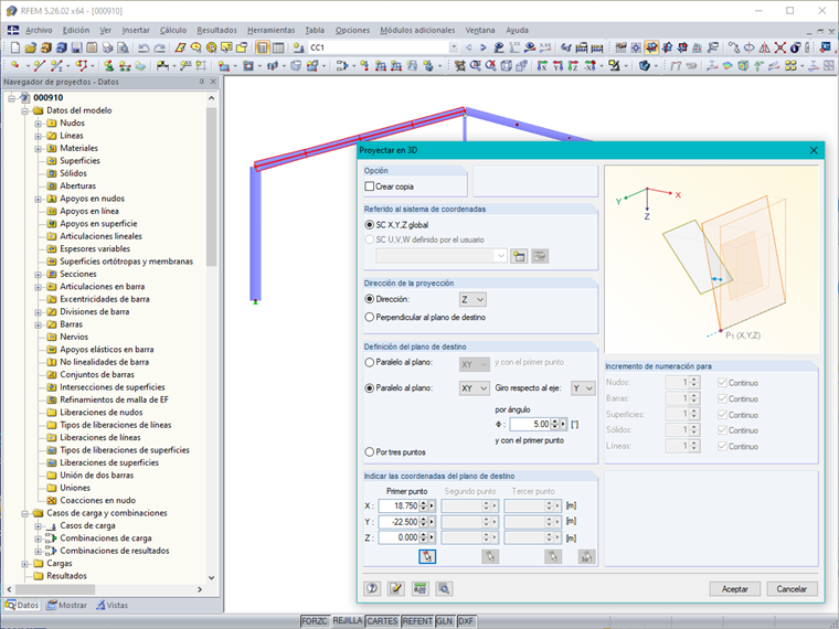 En el siguiente ejemplo, se modificará la inclinación de la cubierta y la separación entre los pórticos de una nave en 3D. Dado que las vigas horizontales o cabios constan de varias barras, sería agotador ajustar cada nudo a la nueva inclinación de la cubierta. En este caso, existe la opción "Proyectar":