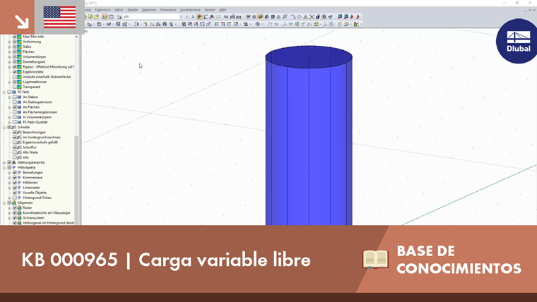 La imagen 01 muestra un contenedor redondo a la izquierda, y se le aplica una carga de altura variable en una dirección normal a la superficie. La representación de la carga libre siempre se refiere a una superficie que queda en un plano definido (plano XZ en este caso) con el eje normal estando en la dirección del eje libre (eje x en este caso).