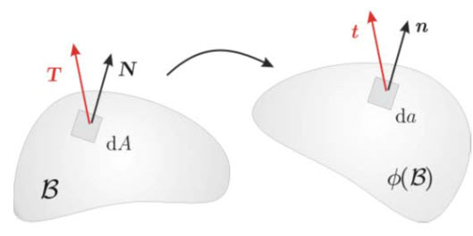 Über einen Verzerrungstensor werden die Verformungen des lokalen Elements im Referenzsystem abgebildet. Die Verzerrung im unverformten Referenzsystem wird dabei über den Green-Lagrange-Verzerrungstensor E = ½ ∙ (FT ∙ F - 1) und die Verzerrung im lokalen Koordinatensystem über den Euler-Almansi-Verzerrungstensor e = ½ ∙ (I - b-1) hergeleitet. Aus diesen beiden Verzerrungen wird über partielle Integration eine lineare Verzerrung ε = ½ ∙ (H + HT) abgeleitet, aus welcher über das Cauchy-Theorem und den Piola-Kirchhoff-Spannungstensor die nominellen Spannungen auf den Körper berechnet werden können. Über die Bilanzgleichungen des Kontinuums können somit freie Energieraten abgebildet werden.