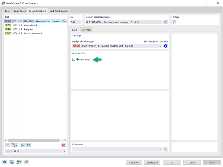 As the image shows, you can do this in the Design Situations tab of the Load Cases & Combinations dialog box. In the Overview tab of the same window, it is possible to display the load combinations assigned for the design situation of interest (Image 3).
