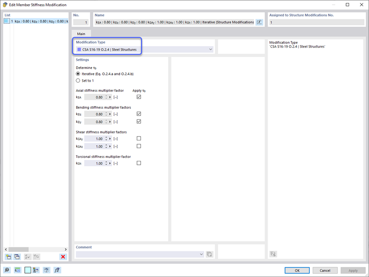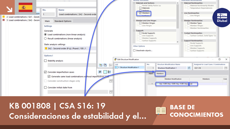 Las reducciones de rigidez se aplican a la Situación de Diseño Última solo una vez más a través de las opciones de definición del Asistente de Combinación y la casilla de verificación "Considerar modificación de la estructura". Se puede crear una nueva definición de modificación de la estructura. La casilla de verificación de "Miembros" se selecciona en la pestaña Principal - Materiales y Secciones. Esto abre una nueva pestaña de Miembros donde se define la Modificación de Rigidez de Miembros según la CSA S16-19 O.2.4 | Estructuras de Acero. Este tipo de definición permite que el programa calcule automáticamente el factor de reducción τb, o se puede configurar un valor generalizado de 1.0 para todos los miembros. Además, el factor 0.8 se puede aplicar a los diferentes tipos de rigidez de los miembros. El usuario puede determinar si el factor τb y el factor 0.8 deben aplicarse solo a la rigidez axial y de flexión del miembro o si también se debe considerar la rigidez al corte y torsional. Una vez que se ingresan las propiedades de modificación de rigidez, la definición se puede aplicar a miembros específicos o se puede establecer el término "Todos" para aplicarse a todos los miembros en el modelo.