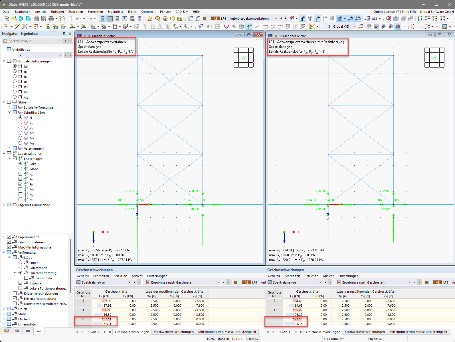 Sin embargo, el esfuerzo cortante en la base es mayor si se omiten las no linealidades y, por lo tanto, está en el lado seguro. Para la evaluación, puede usar una barra de resultados o el complemento "Modelo de edificio".