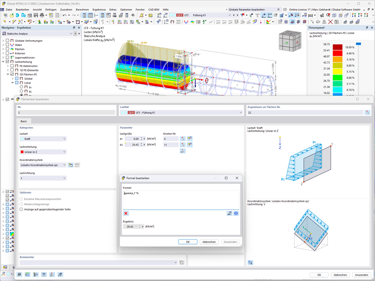 Para la cimentación se asumieron simplificadamente muelles de área constantes en la mitad superior e inferior del depósito. El cálculo se realizó según el método modificado del módulo de cimentación biparamétrico de Pasternak. La profundidad de influencia se determinó a 2,4 m. En la parte superior, el espesor de cimentación se estableció según la cobertura (2 m). Además, aquí se realizó una reducción del 50 % en la rigidez del muelle. Esto se debe a las influencias de la cimentación perturbada debido a la proximidad de la superficie del terreno y a una supuesta compactación no completa durante la instalación. La imagen a continuación muestra la representación de los coeficientes de cimentación elástica en la dirección z, así como el cuadro de diálogo de entrada correspondiente de los parámetros de cimentación aplicados en la mitad inferior.
