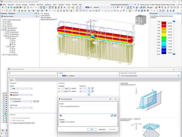 Para este caso se supone que el tanque está temporalmente sumergido hasta la mitad en el agua subterránea. La carga total de flotabilidad se determina según el principio de Arquímedes a partir de la masa del agua desplazada. Su efecto se opone a la aceleración gravitatoria. Por lo tanto, la fuerza resultante actúa en nuestro modelo en la dirección negativa del eje z. Además, aquí se lleva a cabo una distribución de cargas sobre el área proyectada y se supone una carga creciente linealmente en Z. Esto debería, desde el lado seguro, llevar a una sobreestimación de la carga y a un aumento de la ovalización del tanque. La siguiente fórmula muestra la carga de área determinada para estas suposiciones bajo una distribución constante. La entrada se muestra en la imagen a continuación.