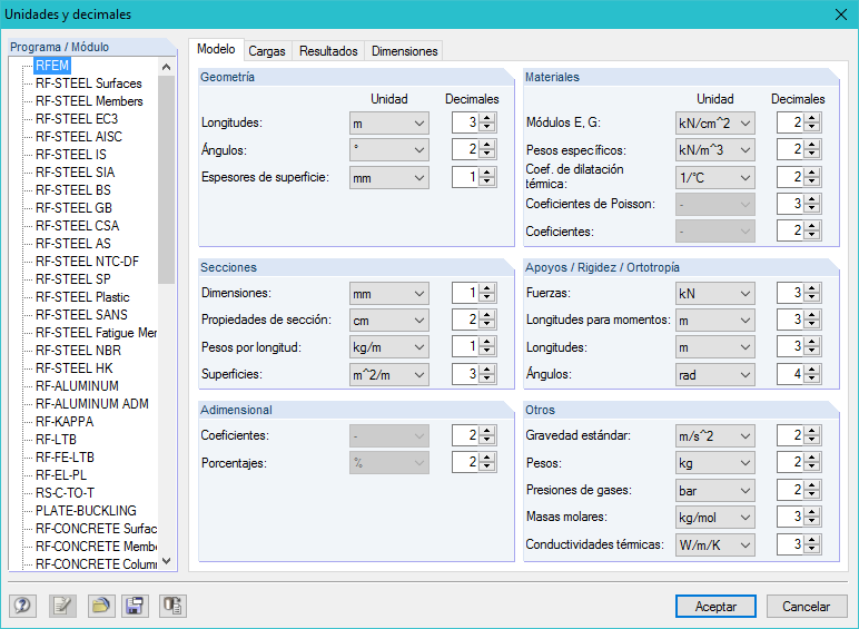 Un cuadro de diálogo global administra las unidades para la introducción de datos, cargas y resultados de RFEM y RSTAB, así como también para todos los módulos adicionales.