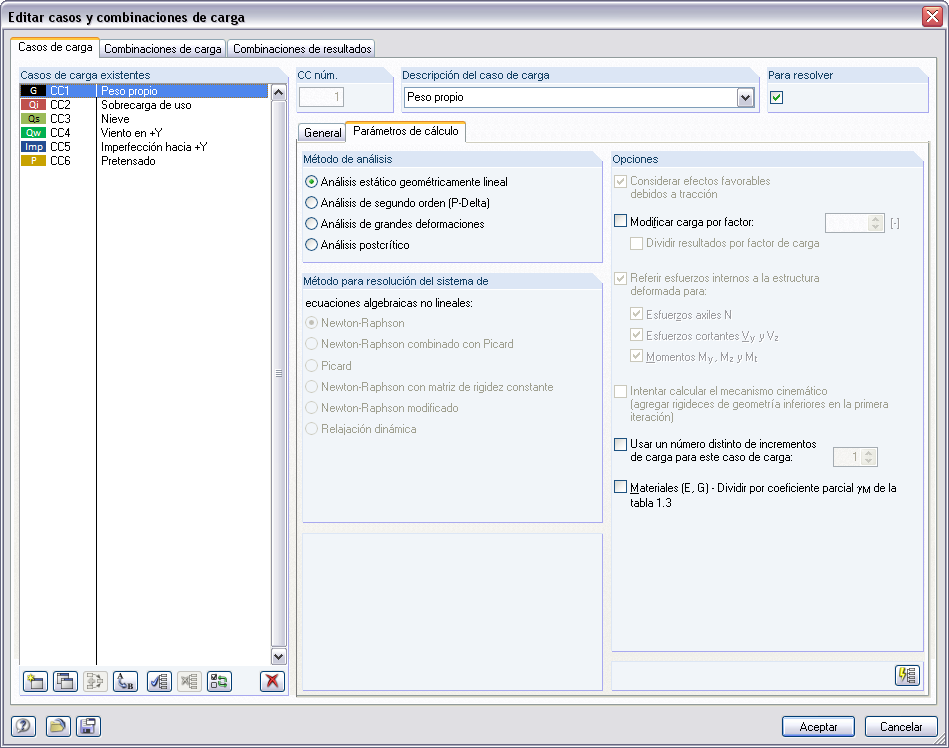 El cálculo se puede realizar para todos los tipos de barras según la estática lineal, de segundo orden, o el análisis de grandes deformaciones. Esta opción de selección está disponible para casos de carga y combinaciones de carga. Los parámetros de cálculo adicionales se pueden ajustar individualmente para casos de carga, combinaciones de carga y combinaciones de resultados. Esto asegura un alto grado de flexibilidad con respecto al método de cálculo y especificaciones detalladas.