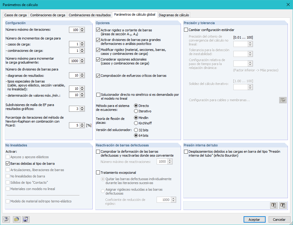 La carga se puede aplicar de forma incremental. Esta posibilidad es especialmente útil para cálculos según el análisis de grandes deformaciones. Para barras, se pueden considerar las deformaciones a cortante y aplicar los esfuerzos internos al sistema deformado o no deformado. Además, RFEM le permite realizar análisis postcríticos.