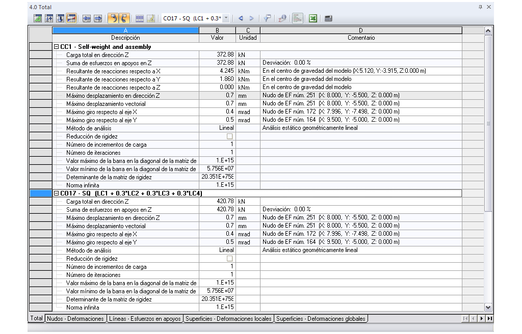La primera tabla de resultados está representada por una vista general resumida que hace balance del equilibrio de fuerzas en el sistema estructural y las deformaciones máximas. RFEM muestra también la información correspondiente al proceso de cálculo. Todas las tablas de resultados se pueden filtrar por un área específica tales como valores extremos o posiciones de cálculo.