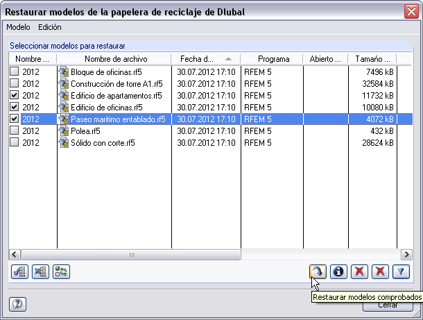 El administrador de proyectos puede crear también subproyectos. Para cada elemento, la información relevante, como la fecha de creación y de la última modificación, así como los nombres de usuario correspondientes. Además, se pueden ver las dimensiones y peso de cada estructura. La papelera de reciclaje integrada puede restaurar los proyectos que se hayan eliminado accidentalmente en la red.