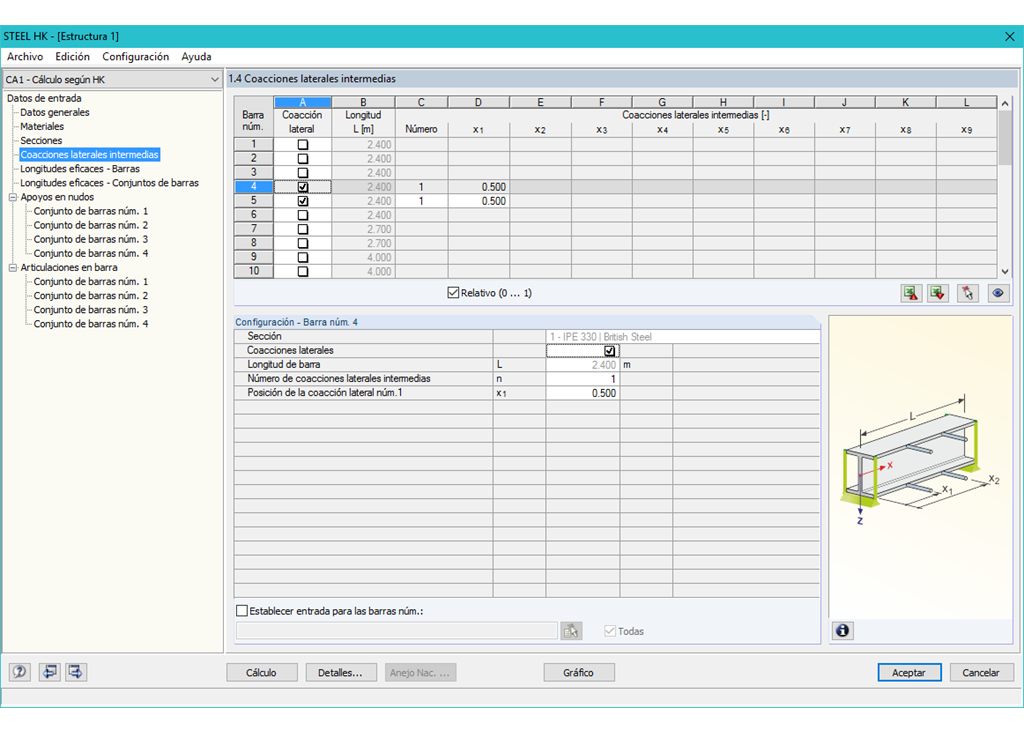 El módulo adicional RF-/STEEL HK requiere el cálculo de barras y conjuntos de barras, así como casos de carga, combinaciones de carga y combinaciones de resultados. En las siguientes ventanas, es posible ajustar los parámetros para las coacciones laterales intermedias y las longitudes eficaces.