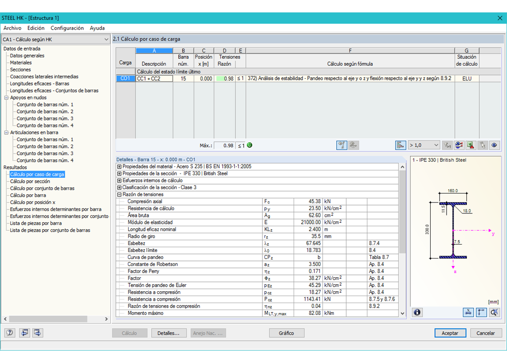 La primera ventana muestra el coeficiente máximo de utilización con el correspondiente análisis para cada caso de carga / combinación de carga / combinación de resultados.