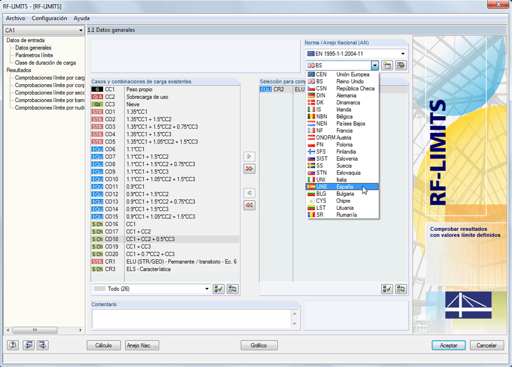 Después de seleccionar las cargas requeridas para el cálculo y, si es necesario, la norma deseada para el cálculo, puede definir las cargas límite en la ventana 1.2 Parámetros límite. Es posible agregar otros fabricantes a los ya incluidos en la base de datos.