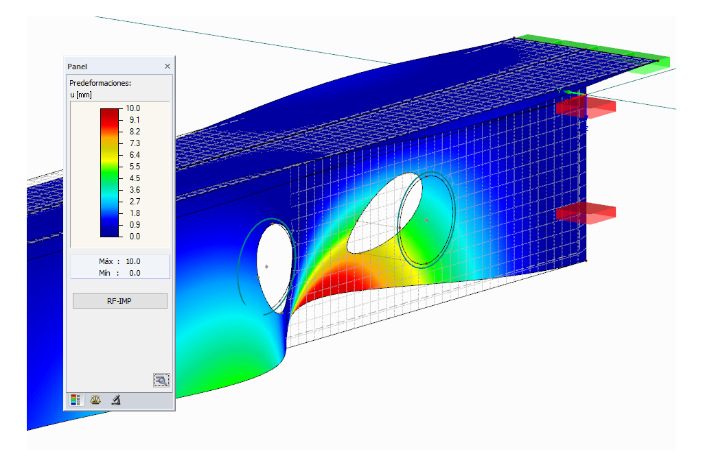 Al generar una malla de EF predeformada en RFEM, los datos de desplazamiento de cada nudo individual se guardan en segundo plano. Esto puede ser usado para el cálculo de las combinaciones de carga en RFEM. Para comprobar los datos generados, el módulo muestra la predeformación en tablas y en el gráfico.