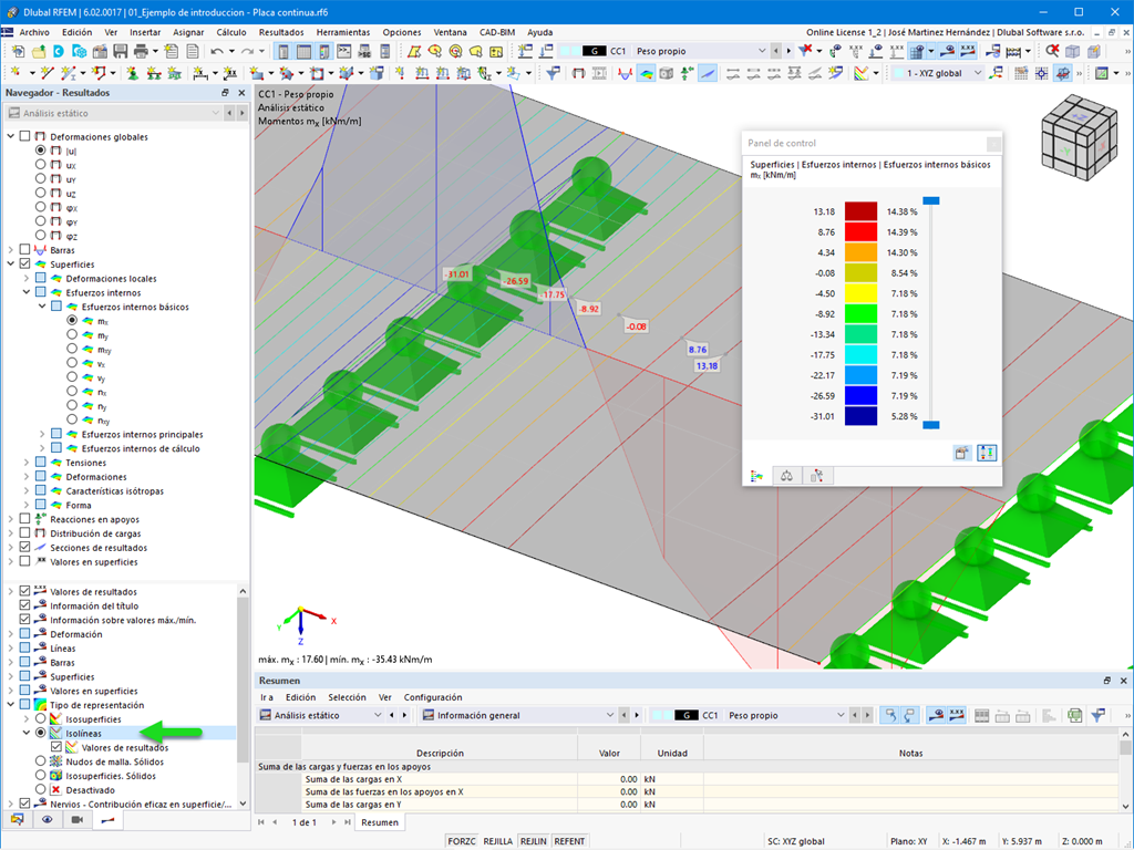 Los valores de los resultados para deformaciones, esfuerzos internos, tensiones, etc. se pueden mostrar en las isolíneas.