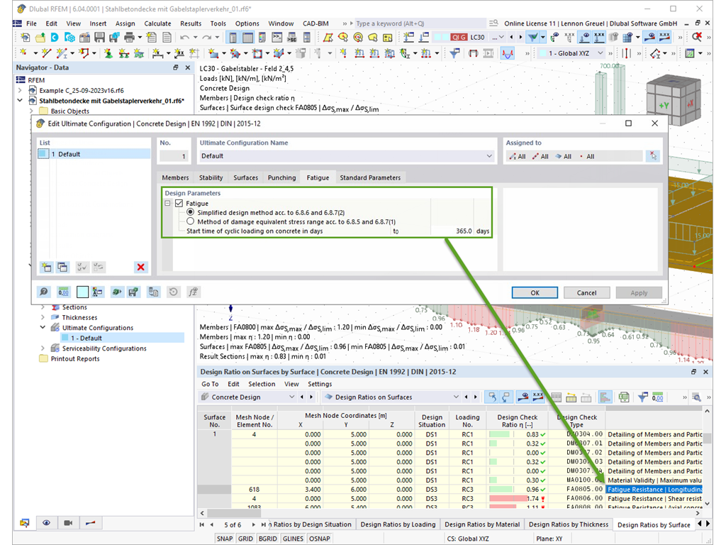 - Nivel de cálculo 2: Cálculo de la tensión de daño equivalente según 6.8.5 y 6.8.7(1) (cálculo simplificado frente a la fatiga): El cálculo utilizando carreras de tensiones de daño equivalente se realiza para la combinación de fatiga según EN 1992-1-1, capítulo 6.8.3, ecuación (6.69) con la acción cíclica Qfat definida específicamente.