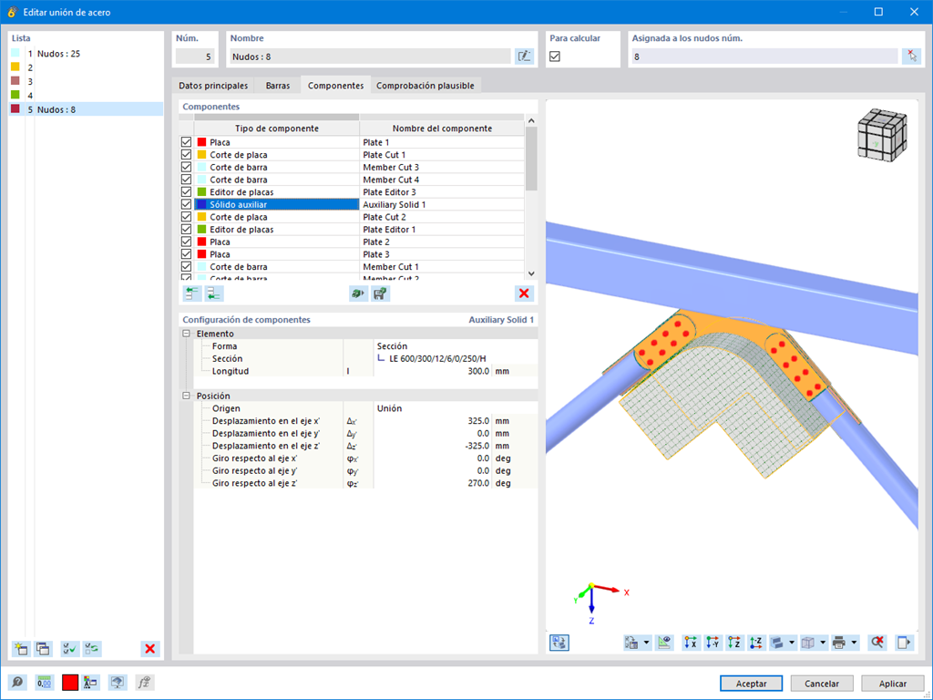 En el complemento Uniones de acero, puede realizar cortes precisos en placas y componentes estructurales utilizando el componente Sólido auxiliar. Dentro de este componente, puede usar las formas de un cajón, un cilindro o cualquier sección como objeto auxiliar.