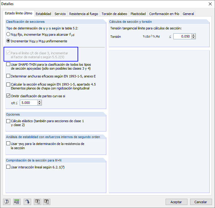 Según EN 1993-1-1, solo es posible aumentar el factor de material en función de las tensiones aplicadas si no se realizan análisis de estabilidad con el cálculo de la barra equivalente. Da die Ersatzstabnachweise im folgenden Reiter "Stabilität" standardmäßig aktiviert sind, ist die Option ausgegraut.